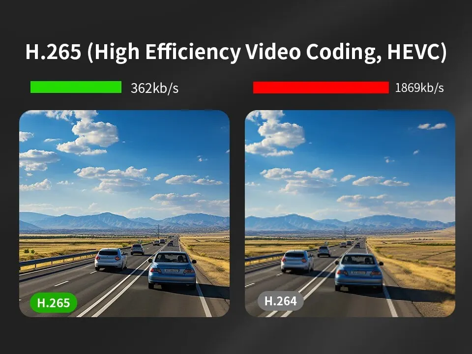 A codificação H.265 oferece eficiência de transmissão mais rápida e maior qualidade de imagem do que H.264, dobrando a compressão e economizando 50% de espaço de armazenamento (verifique se o seu player suporta o formato de vídeo H.265).